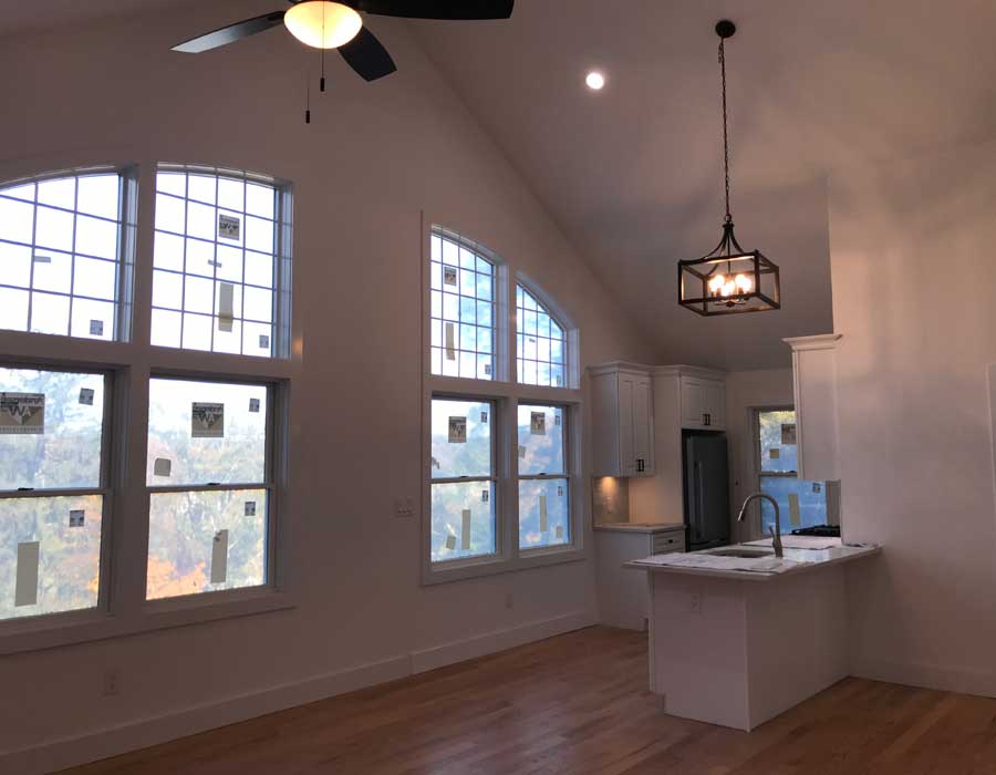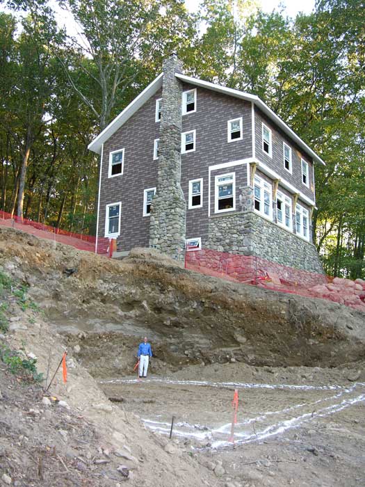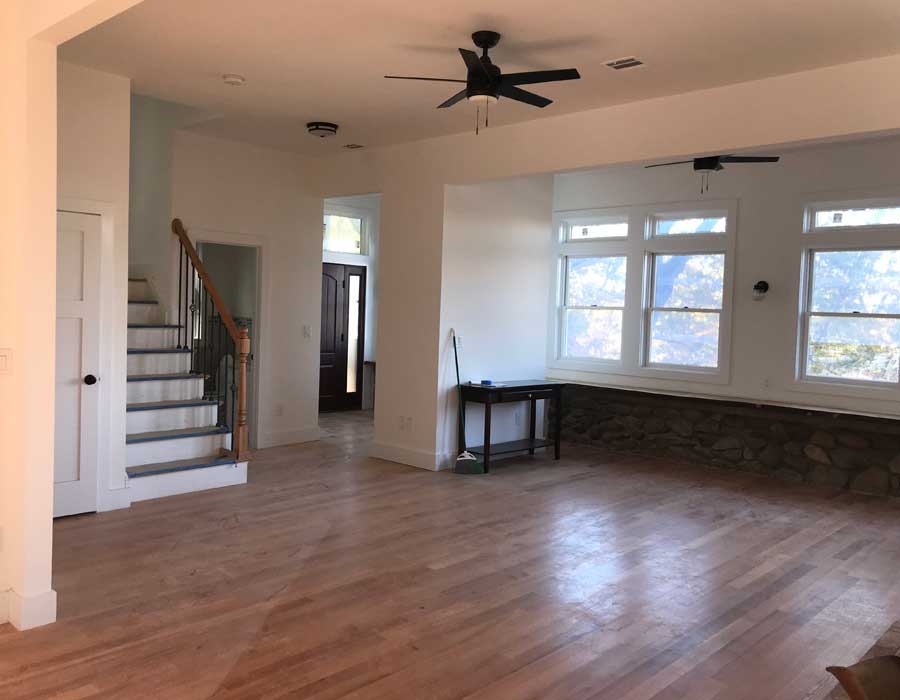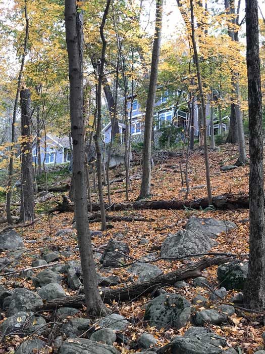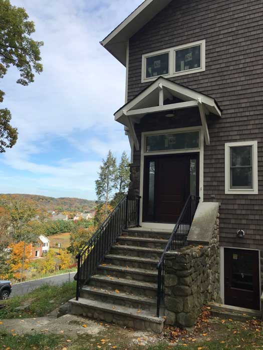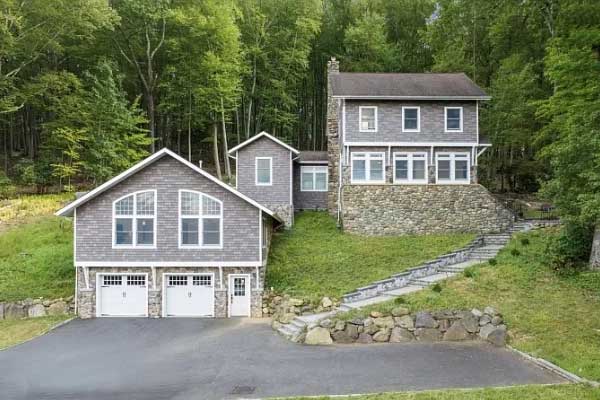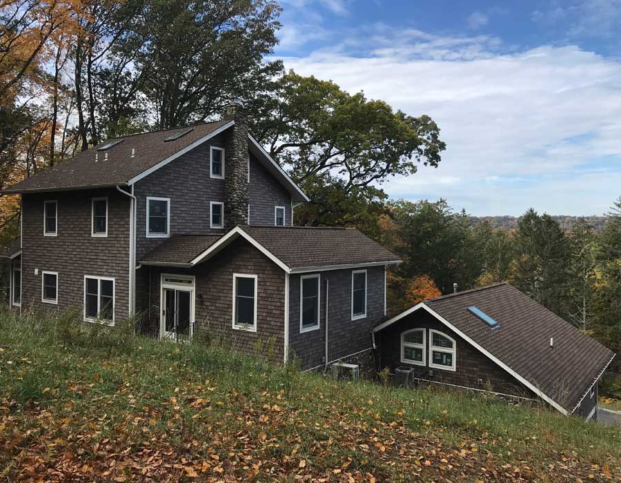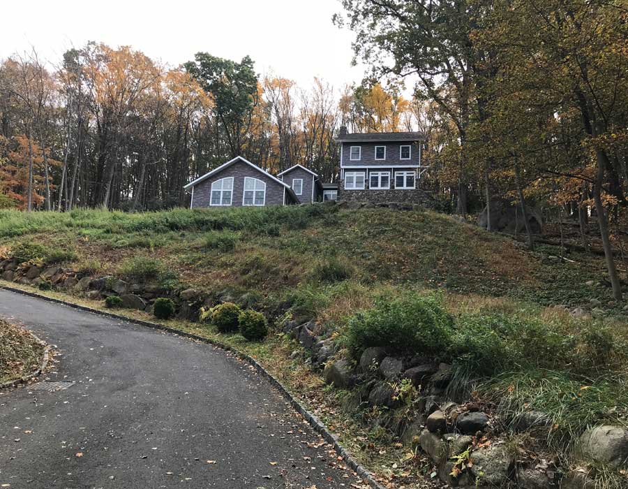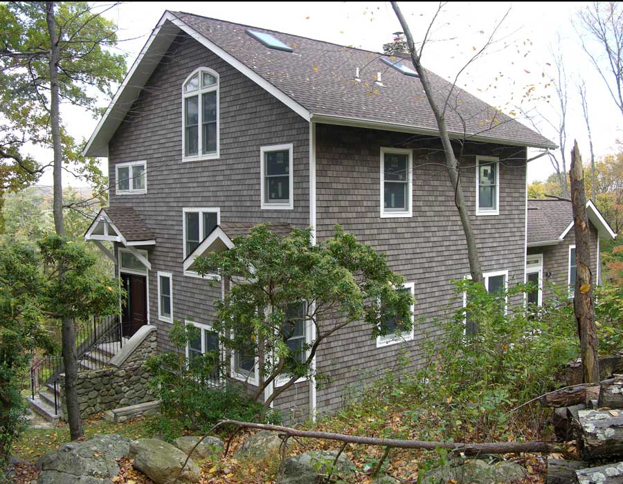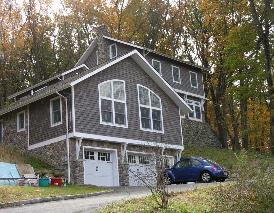 From a small hunting cabin in the woods to a spacious multi-structure home nestled into the side of a mountain overlooking the valley.  Requiring a steep slope variance, the extreme terrain and grade became integral elements of the design.  The main house remained in the footprint of the cabin, retaining only the original fireplace and exterior stone wall.  The new garage with an in-law suite above was built down at the driveway level, 40 steps below.  The structure connecting the two provides interior access between them while accommodating the extreme change in elevation.